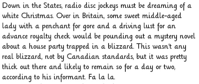 Even though Rudolph only exists on the pages it feels real. You know these people. You love some. You dislike some. You want to hit some over the head with a candy cane. You want this nasty murder business solved and out of the way for Vicky and Merry and the entire town because, really, murder in "America's Christmas Town" would not be good for tourism. You know, for the town that no one can really get to anyway.